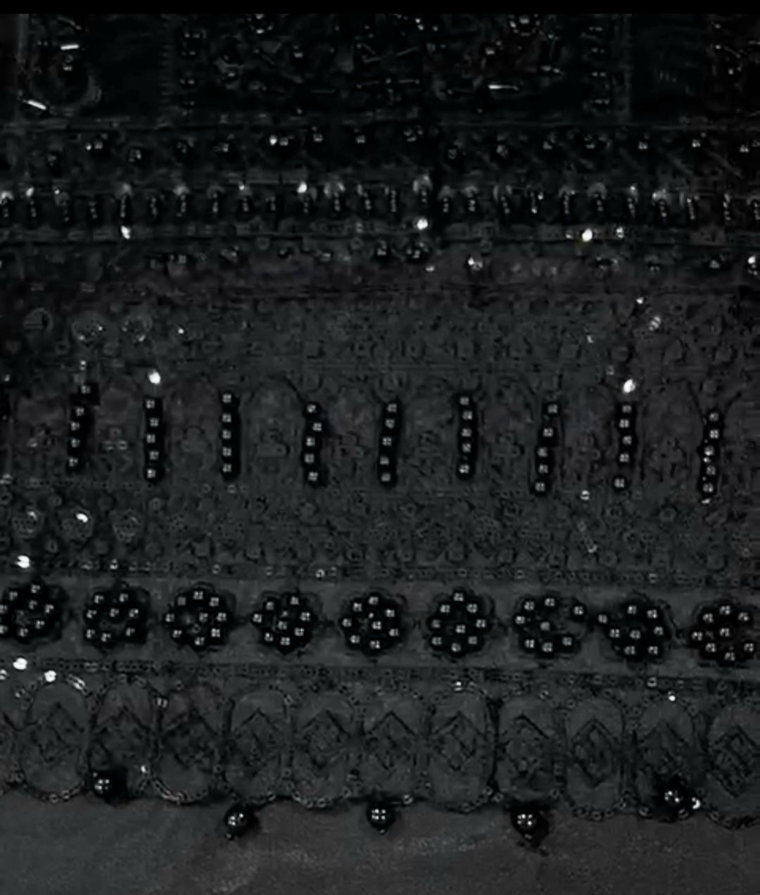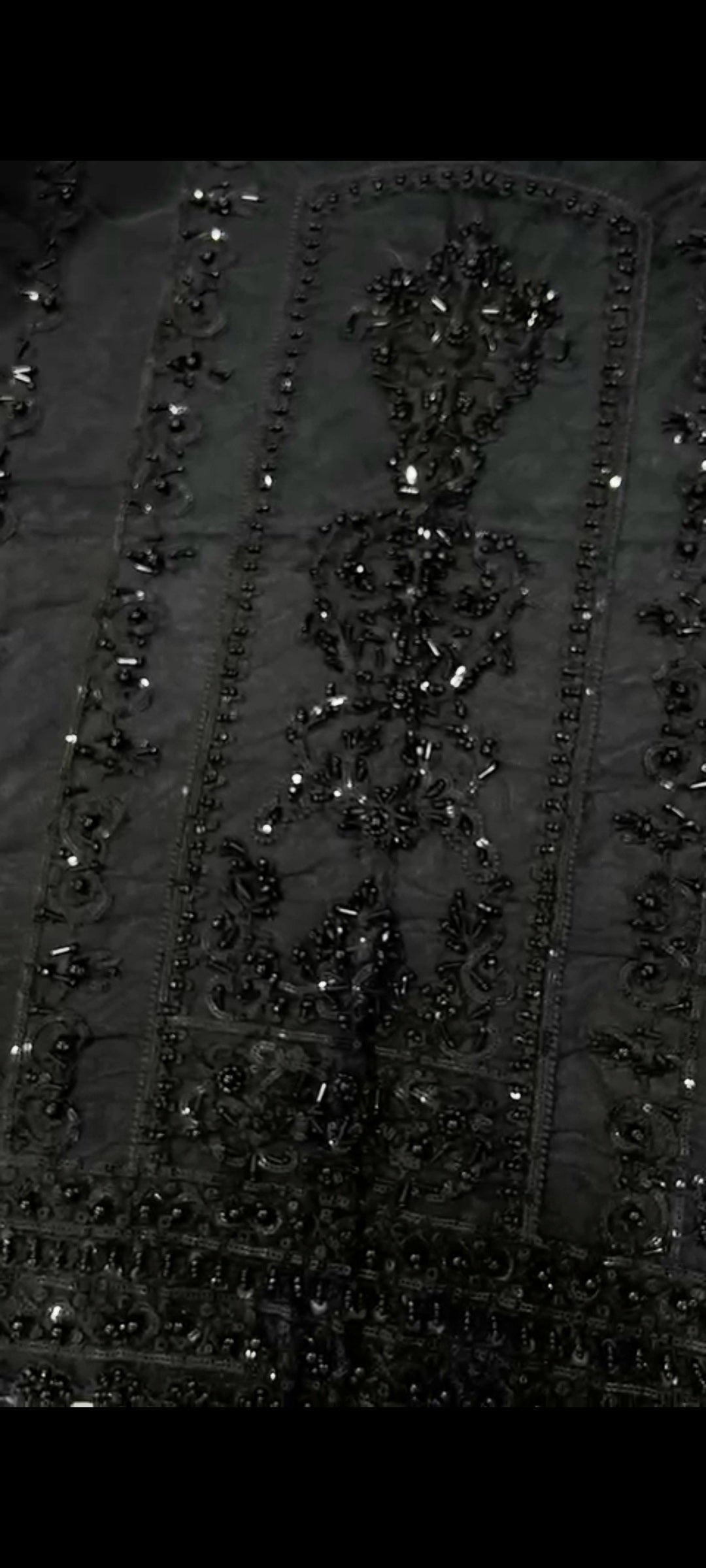 Sleeves: Richly embroidered with sequence and intricate hand adda work